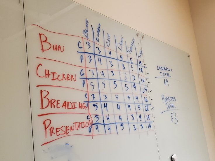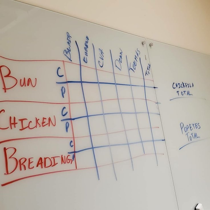 This is the criteria we agreed upon with a scale of 1-5, with 5 being the best. There’s a Popeyes across the street from work and a Chic Fil A about 5 minutes away, so it wasnt a big deal getting the food, except for the extra long line at Popeyes.